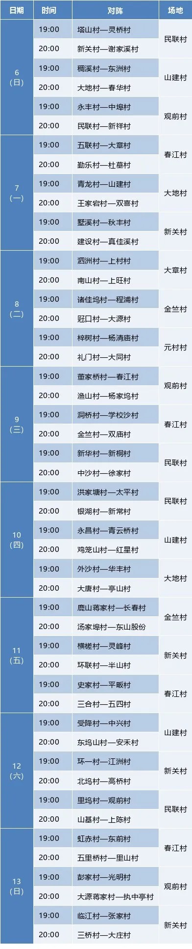 Kilpailu pidettiin yhdeksällä kilpailuvyöhykkeellä: Minlian kylä Dongzhou -alaosassa; Dadi Village, Jinzhu Village ja Guanqian Village (Zhougongwu) Yinhu -alaosassa; Chunjiangin kylä ja Shanjian Village Chunjiangin osa -alueella; Yuanin kylä Xinengin kaupungissa; Changlv Town Basketball Hall; ja Xinguan -kylä Dayuanin kaupungissa . Tänä vuonna vielä useammat ihmiset voivat seurata jännittäviä pelejä aivan heidän kynnyksellään.